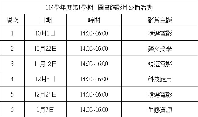 為鼓勵同學正向休閒並讓同學能善用時間吸收新知,本校圖書館本學期於一樓展演區安排6場次電影欣賞公播活動,每場次將搭配不同主題,時間及主題規劃如下,再請同學們踴躍參加。